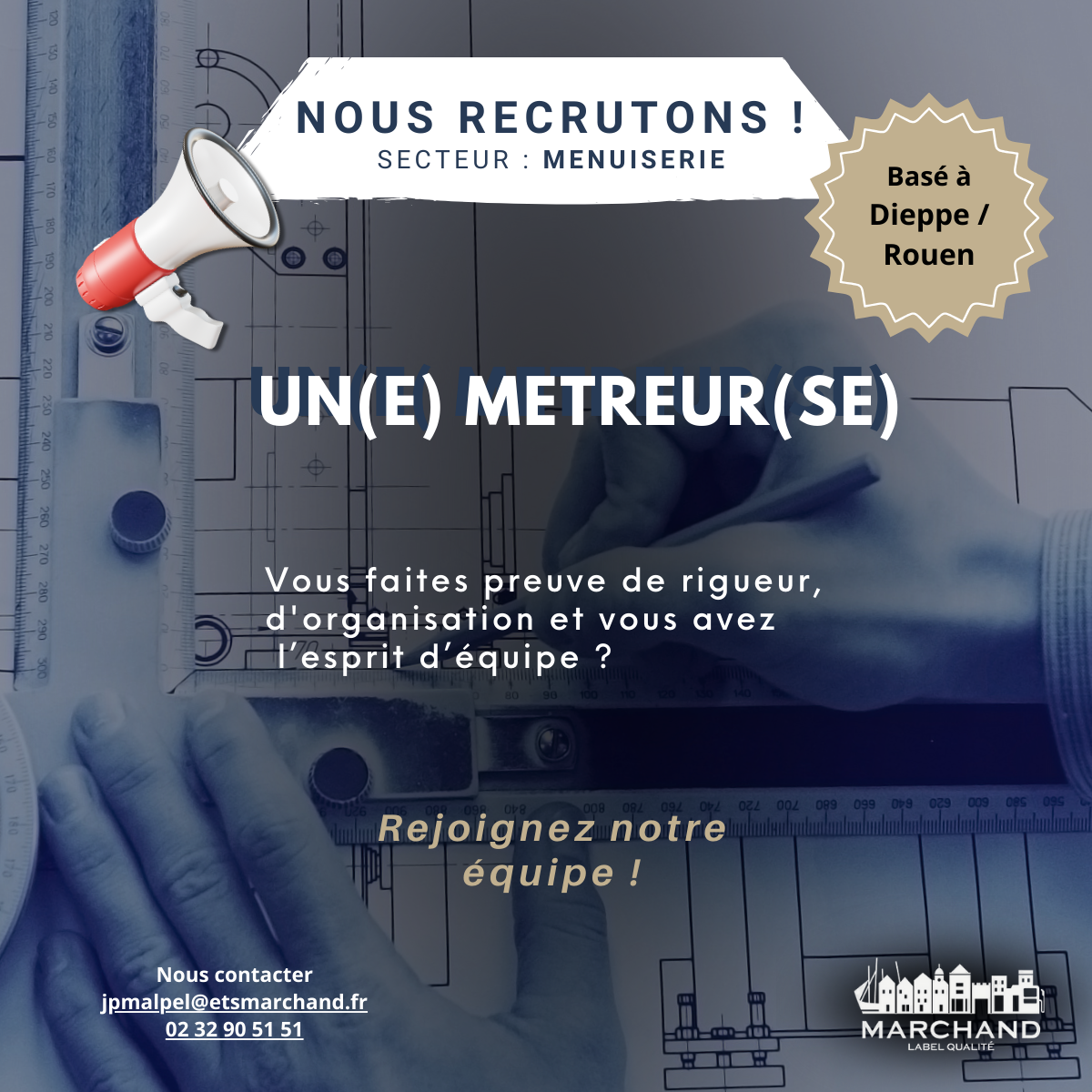 Dans le cadre de notre activité de menuiserie sur le secteur de Dieppe et Rouen; nous recrutons un métreur (H/F)